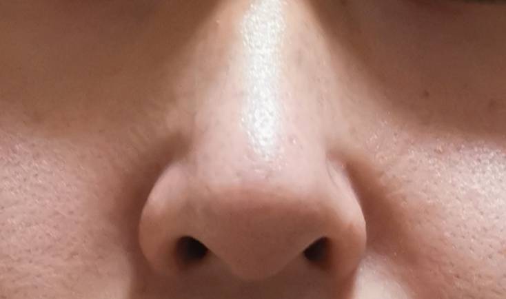 100円玉サイズにホホバオイルを手に取り、鼻に塗り込むようにマッサージする。